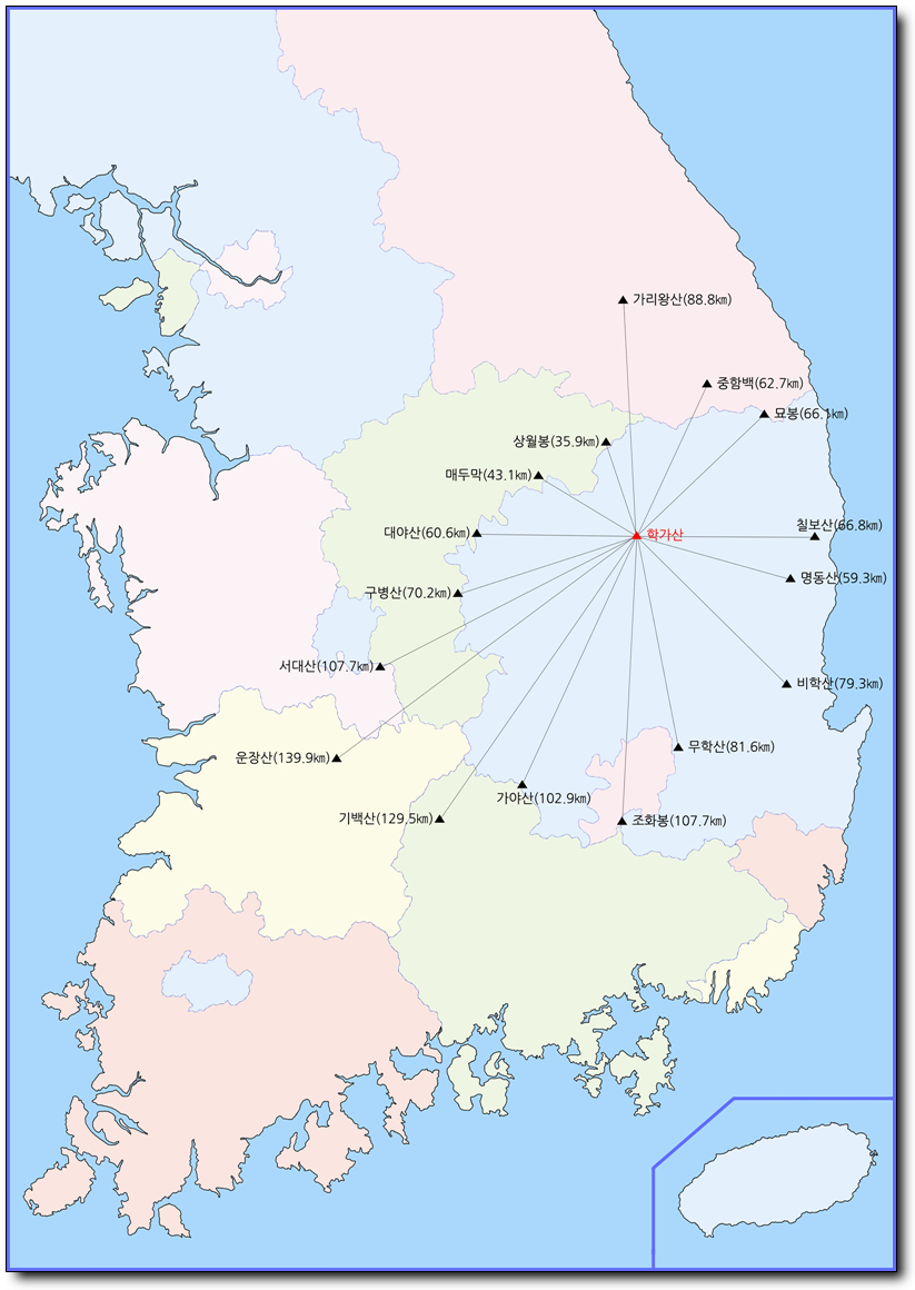 # 학가산 국사봉에서 볼 수 있었던 방향별 최장거리 위치의 산