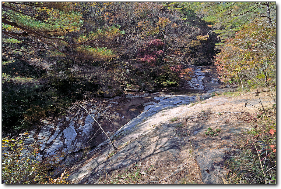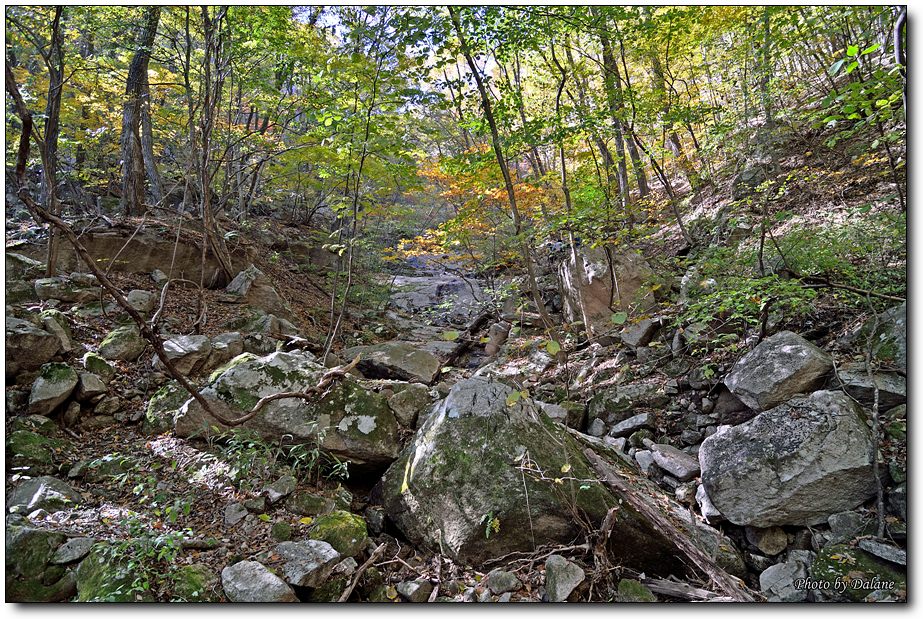 # 23. 무명폭포 아래에 이릅니다. 딱히 이름이 없는 폭포라 그냥 '무명폭포'라 이름 지어봤습니다. 수량이 적을 때엔 그저