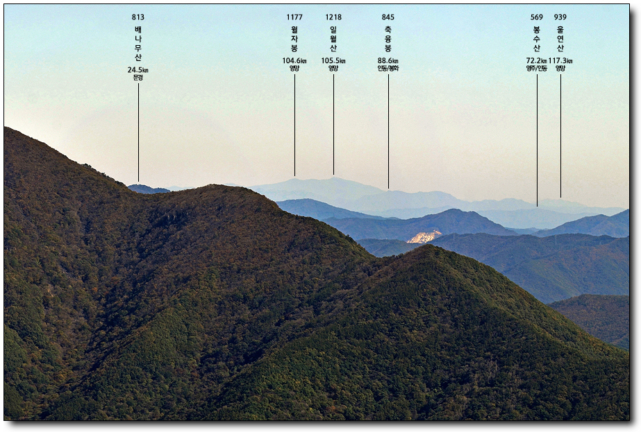 문경의 희양산, 주흘산, 황장산이 시야에 들어오고 오정산 너머로 멀리 영양의 일월산도 거리에 비해 비교적 선명하게