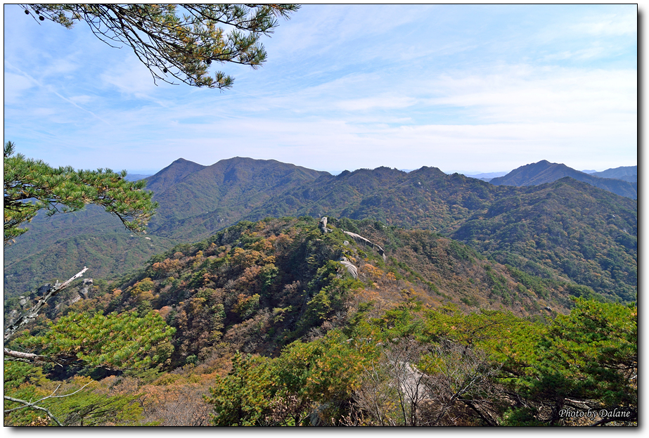상학봉으로 이어지는 속리산톱날능선이 인상적입니다.