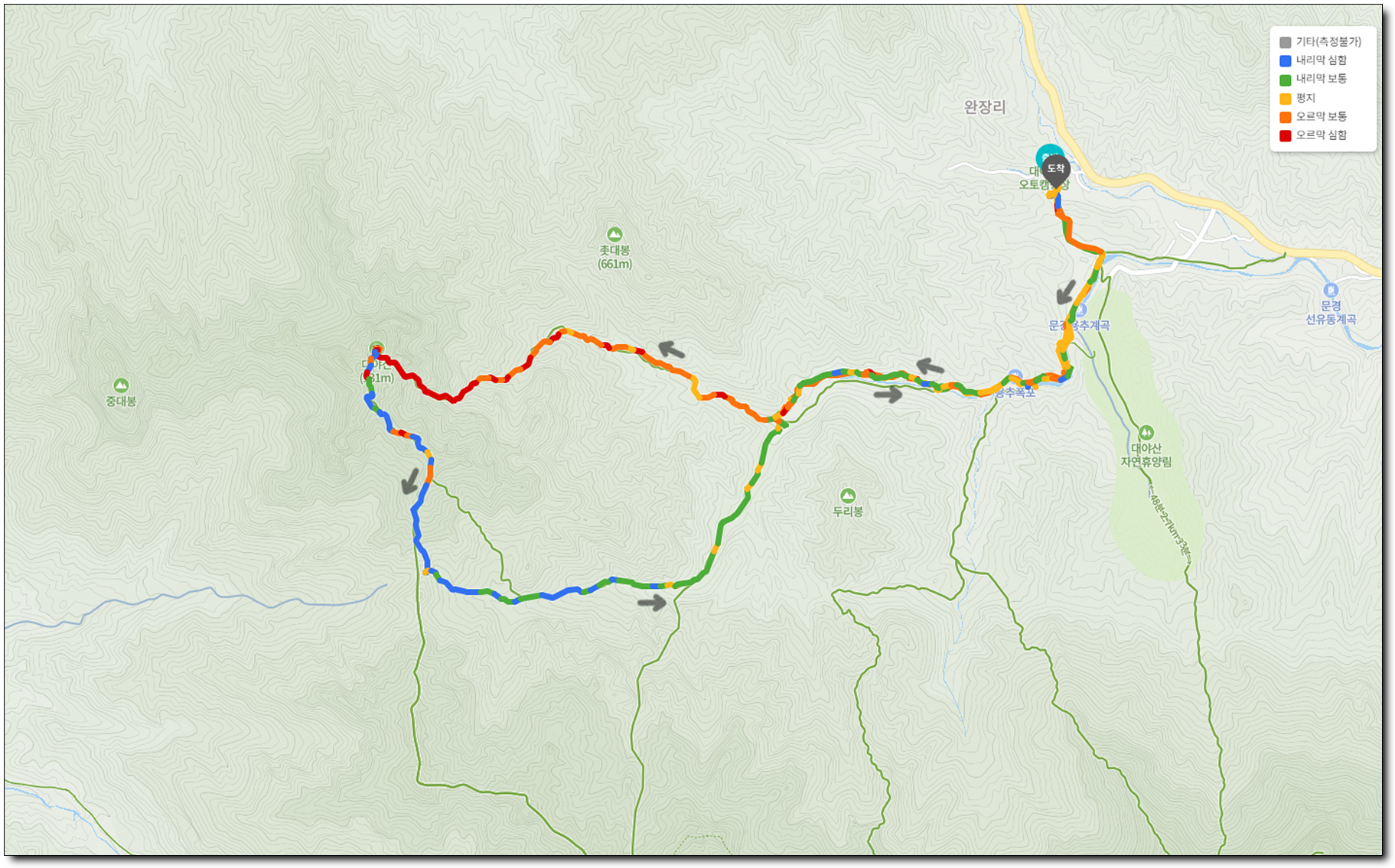 # 82. 예상했듯 피아골 대야산 정상 직전 구간은 시커먼 색.. 최고 난도 구간이란 뜻이죠.