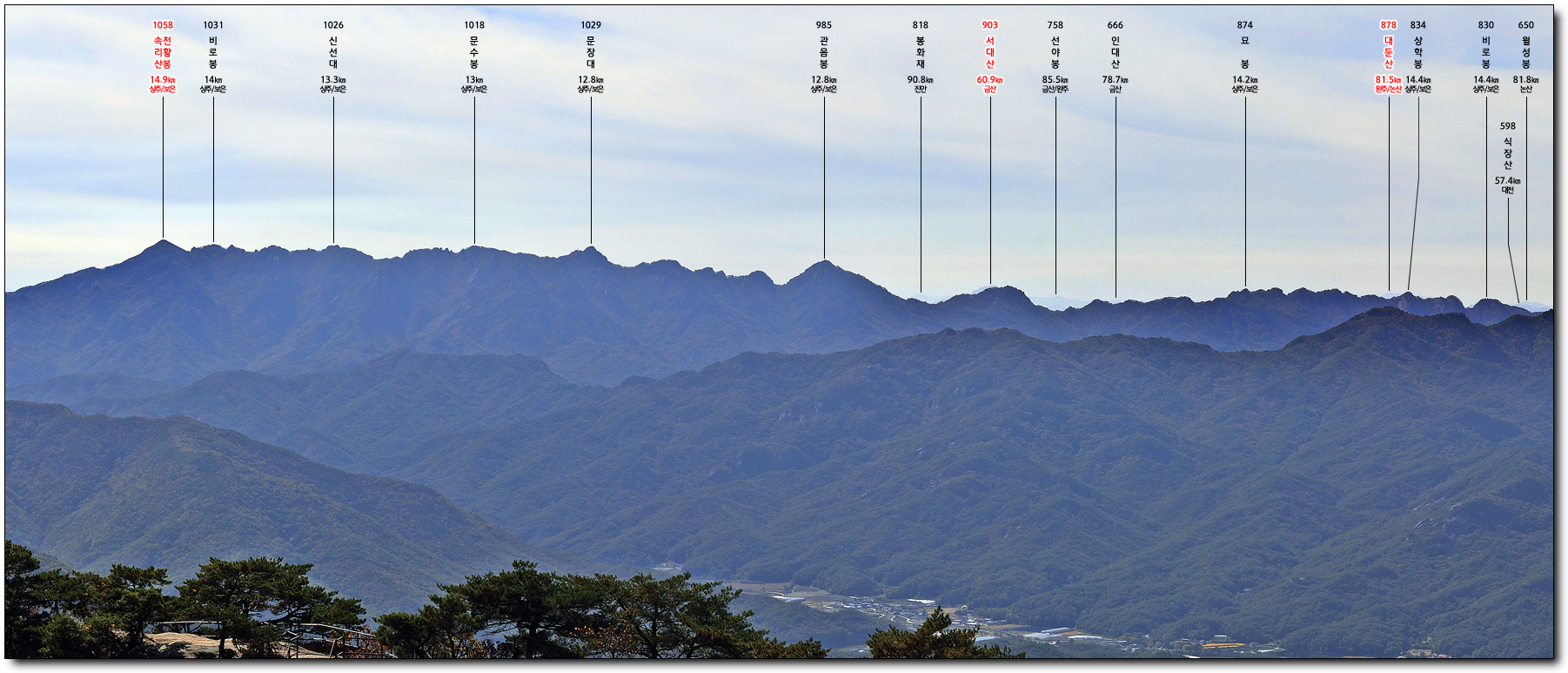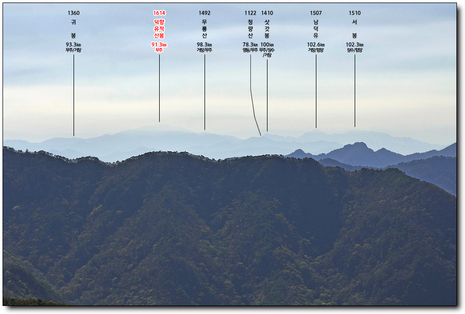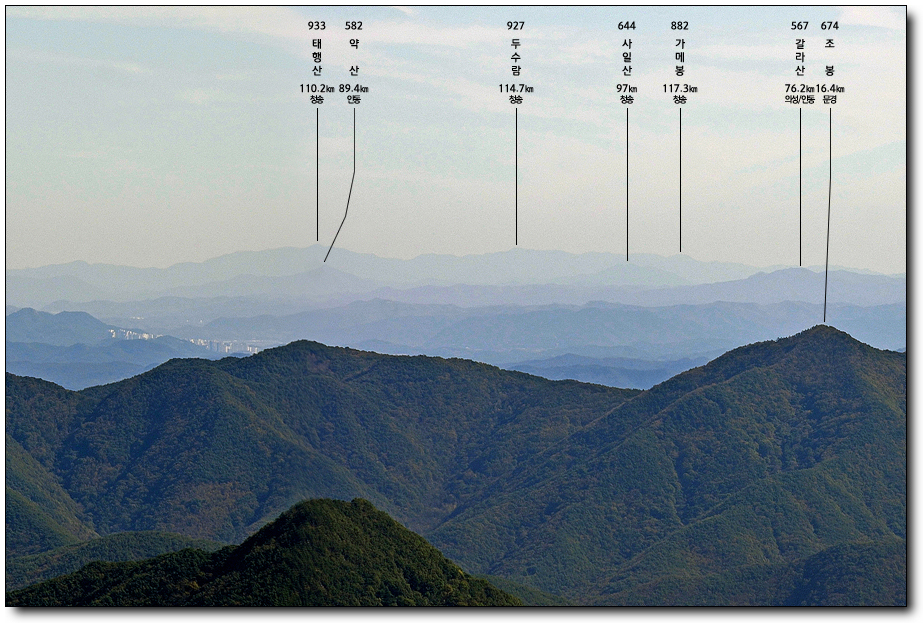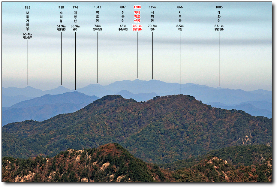 즐길 수 있게 되었습니다. 대야산 조망도는 13년 전 산행 후 만들긴 했지만 가시거리가 고작 3~40㎞ 내외의 날씨였기에