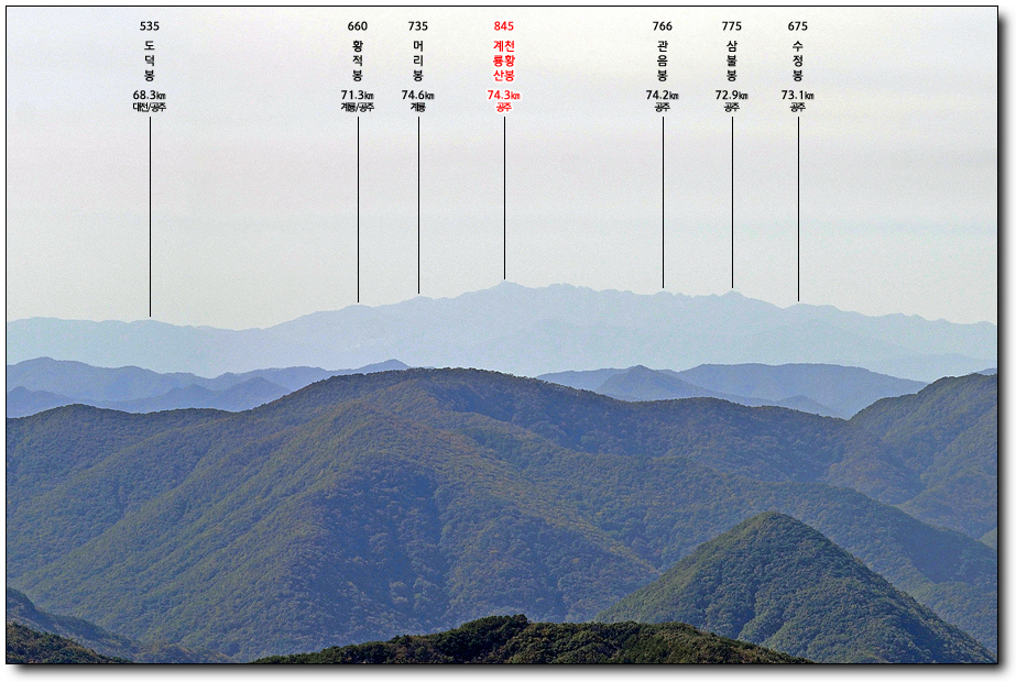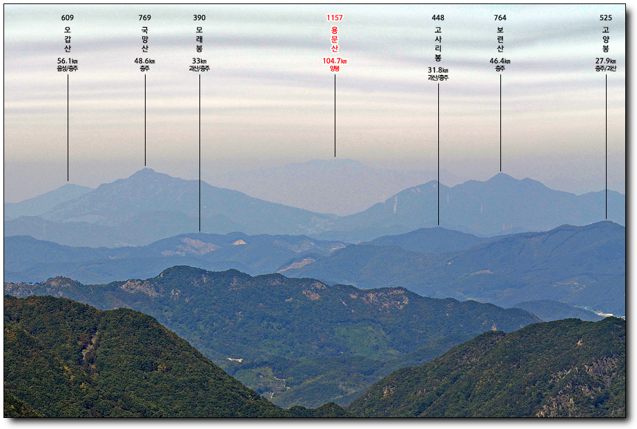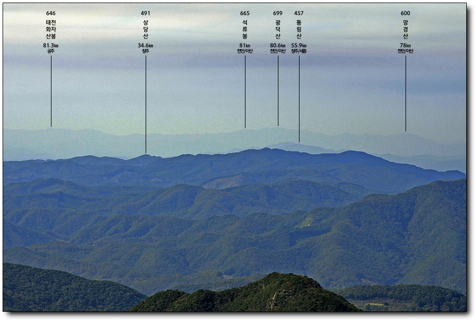 충청 지역의 여러 산들이 시야에 들어옵니다. 이 방향은 그리 높지 않은 고만고만한 봉우리들이 있는 방향이라 쉽게